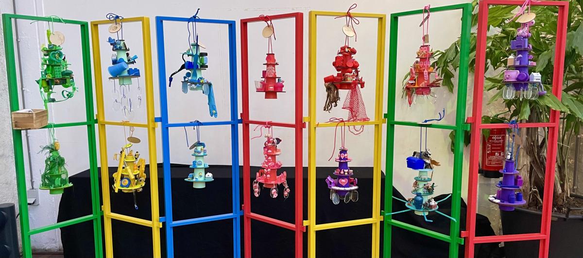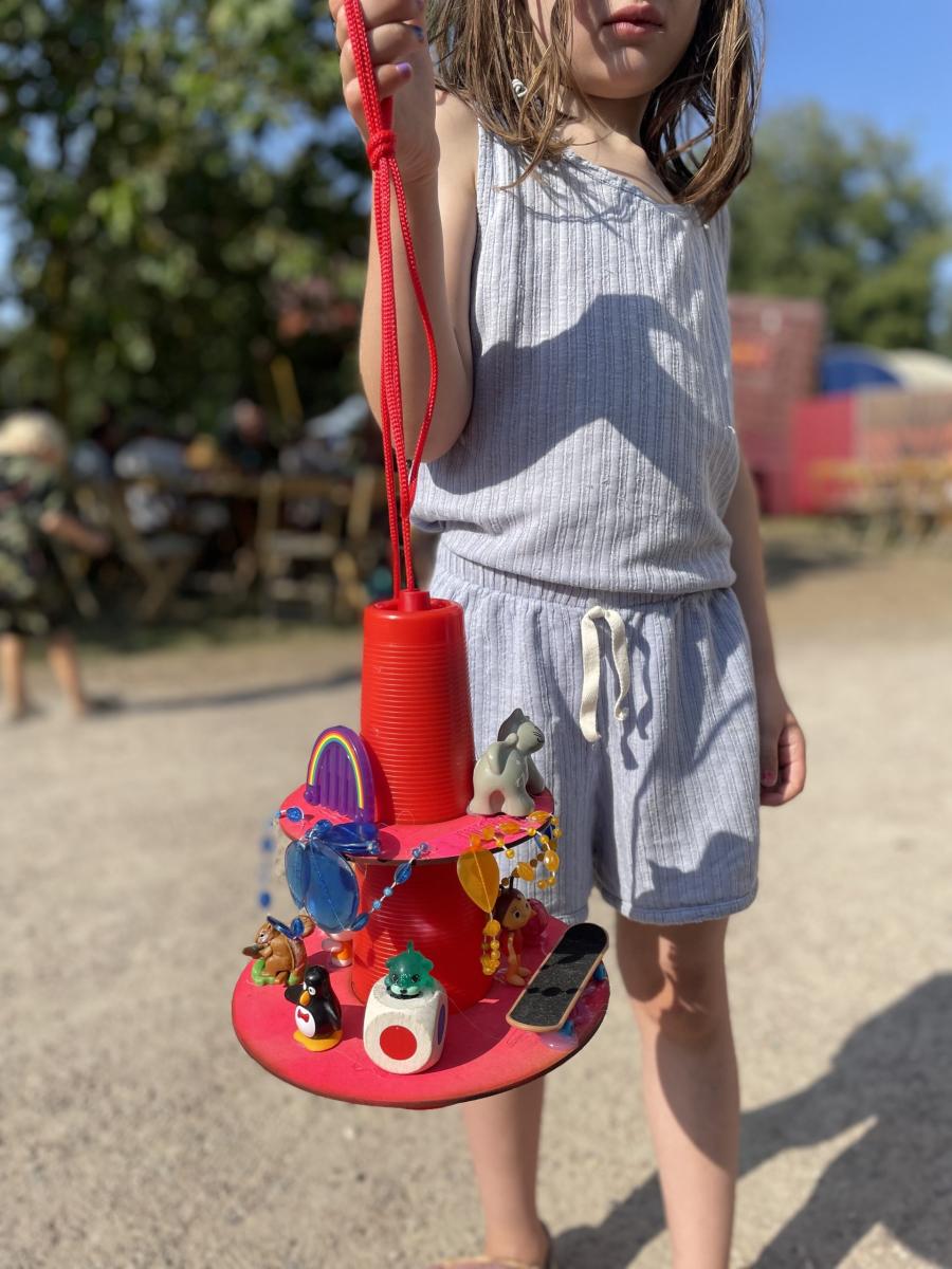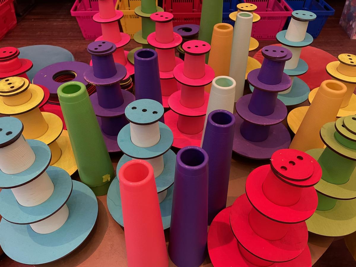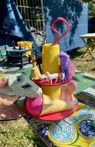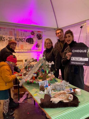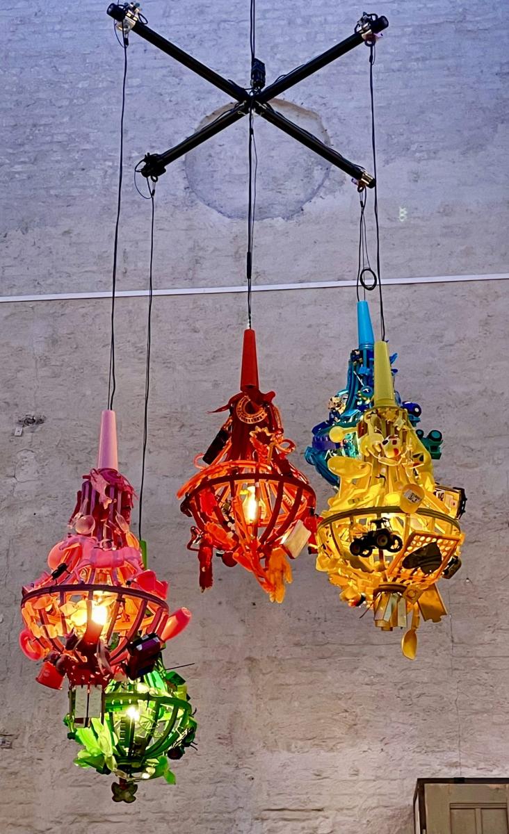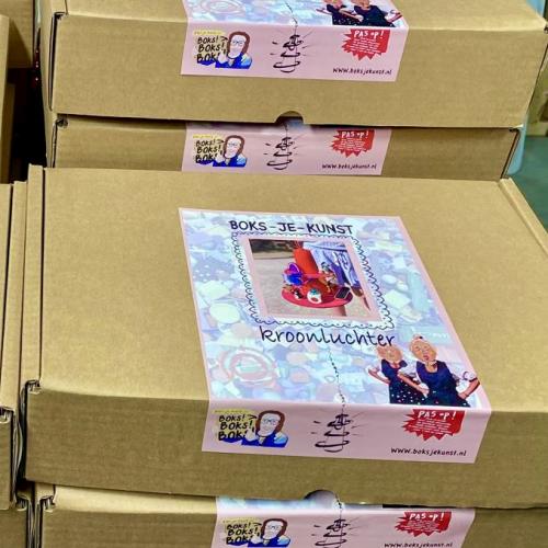 Boks-je-Kroonluchter is ontwikkeld voor Jeugdtheater de Krakeling en voor Theaterfestival de Parade 2024 Amsterdam. De basis van Boks-je-Kroonluchter is een plastic cone afkomstig uit de textielindustrie, 2 gelazerde rondjes uit recycle hout, plastic speelgoed afval en een treklampje, alle speelgoed wordt met een klein lijmpistooltje vastgelijmd.